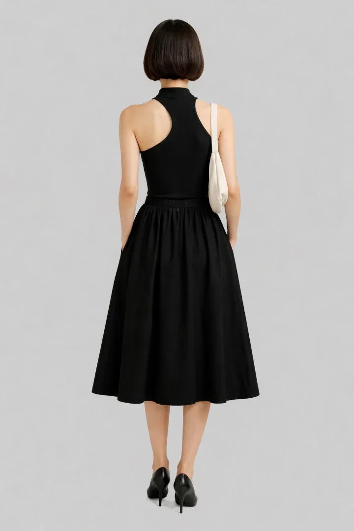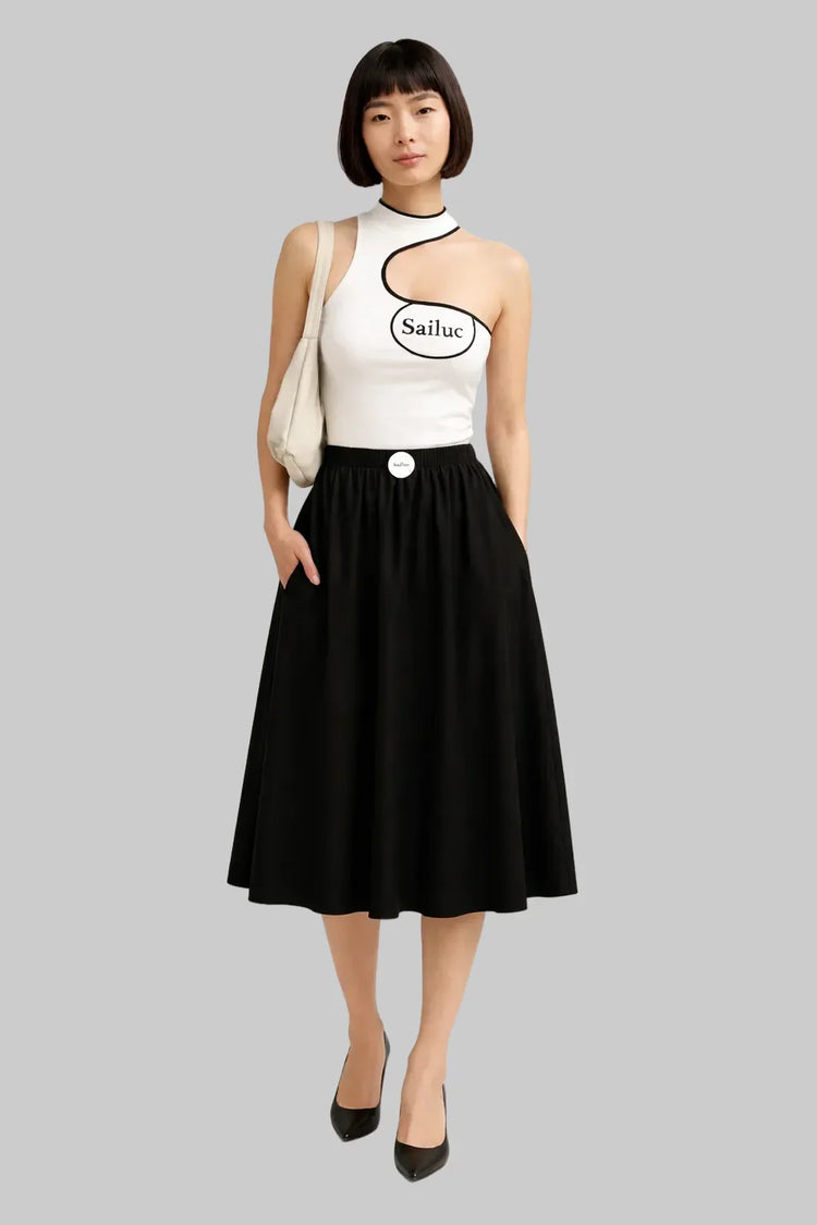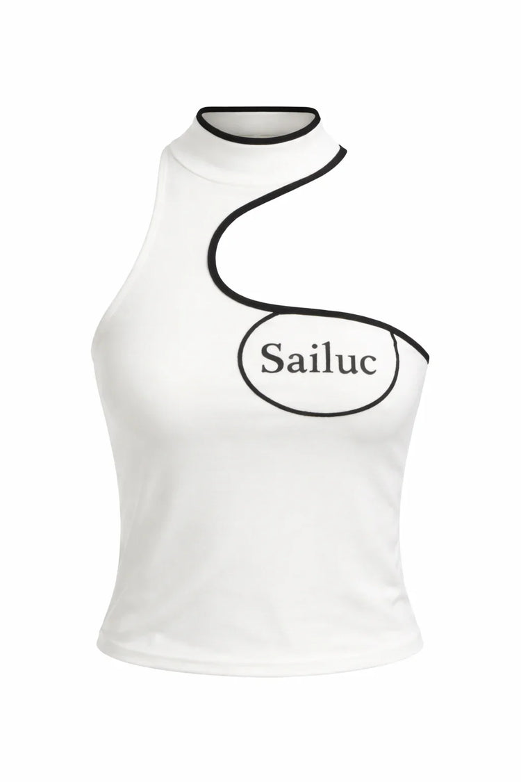 The Halter Sleeveless Asymmetrical Tank Top blends minimalist structure with contemporary edge. Designed with a clean halter neckline and an asymmetrical hem, it redefines balance and proportion through Sailuc’s signature lens of modern elegance.